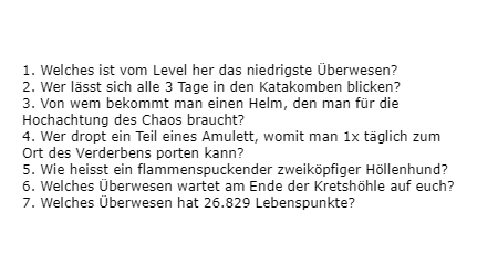 Zitat von »Sherwood« 1 Baltasar 2 Knochendrache 3 UjarrMo in Exil 4 Gorbachs Skelett 5 Kerberos 6 Spinnen Patriarch 7 Skorpionenzar Lösung: Harzida