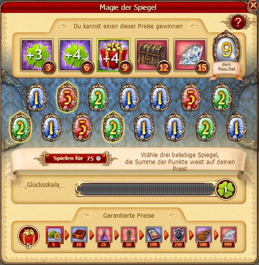 Der Weg zur Spiegelwelt scheint immer durch die Spiegelflächen geschlossen zu sein. Jetzt aber stehen die Sterne am Himmel in einer besonderen Konstellation, weswegen sich die Bewegung feiner Elemente ändert und so die Tore zur Spiegelwelt geöffnet werden. Diese seltene Chance nutzen die Spiegelgeister, die davon träumen, das Gold aus aller Welt sammeln zu können. Man sollte aber keine Angst vor der Invasion der Geisterarmee haben. Die Geister schlagen den Kriegern ein einfaches Glücksspiel vor. Nur jetzt mit 75 könnt ihr in den Besitz der seltensten Artefakte kommen, die nirgendwo sonst zu bekommen sind. Versuch dein Glück im Spiel mit den Geistern der Spiegelwelt! Beeilt euch Krieger, denn das Ereignis "Magie der Spiegel" wird nicht ewig dauern!